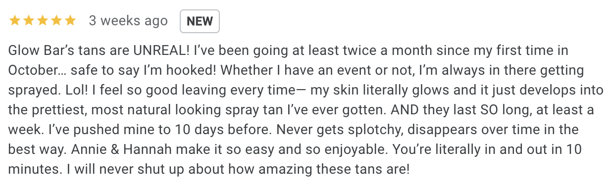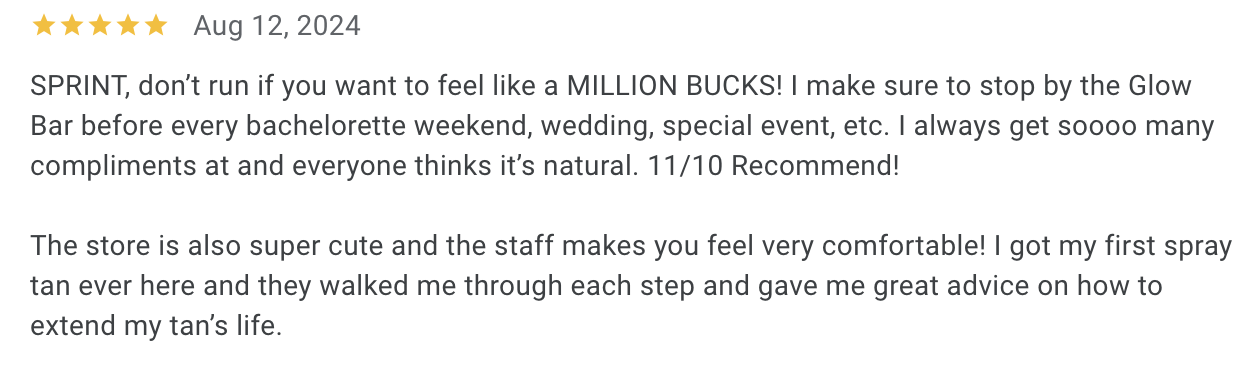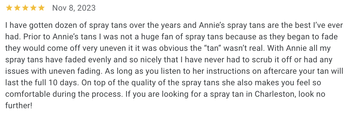 At Glow Bar CHS we believe confidence starts with a tan. Since starting Glow Bar CHS in 2020 we have been dedicated to offering flawless, high-end spray tans in Charleston. Founded by Annie McPhaul, an Ole Miss grad with a finance degree and a serious eye for detail. We’re not just obsessed with bronze skin, we are passionate about elevating the entire tanning experience!